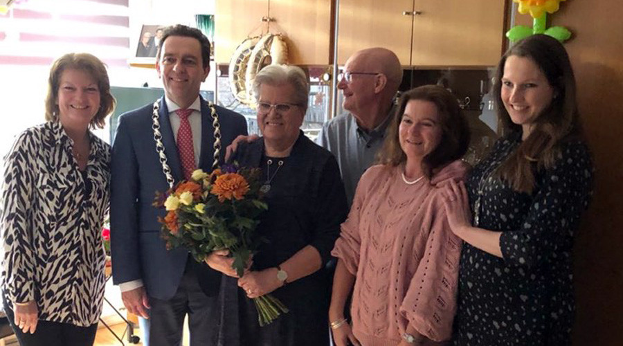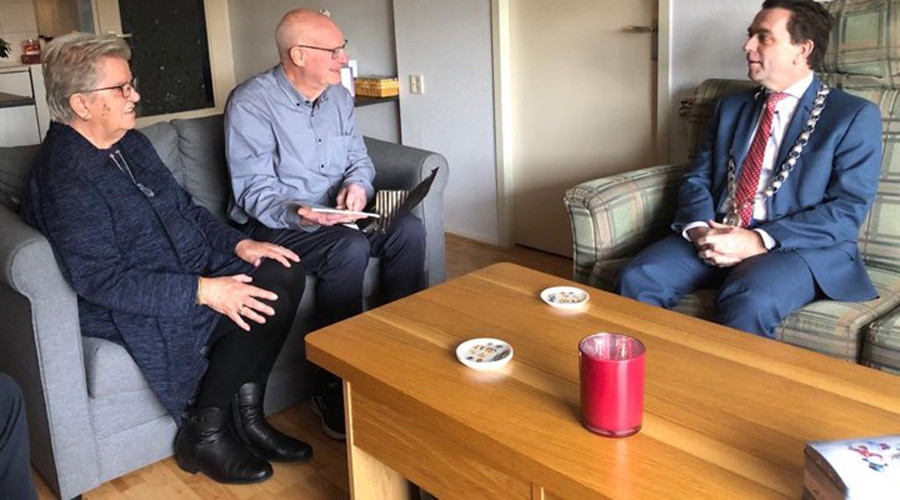 Maandag bracht burgemeester Bezuijen een bezoek aan het echtpaar Simonis-Freeze voor hun zestigjarig (diamanten) huwelijk. In de woning aan het Vredenburchplantsoen waren tijdens het bezoek ook de kinderen van het echtpaar aanwezig, en één van hun twee kleinkinderen. Terwijl hond Luna de handen van de burgemeester schoonlikt, vertellen Annie en Gerard over hun eerste ontmoeting als prille tieners tijdens een jeugdkamp van de VJB.