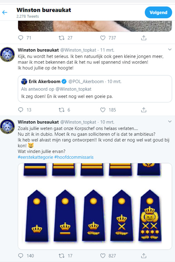 Erik Akerboom, per 1 maart 2016 benoemd tot korpschef van de Nationale Politie, moedigt op Twitter onze ‘nationale’ bekendheid, bureaukat Winston, aan om te ‘solliciteren’ op de functie van korpschef.