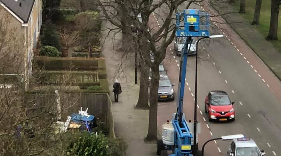 Houtan Natash meldde een in zijn ogen gevaarlijke situatie dat een hoogwerker aan de Harpsingel tegen een boom stond ‘geparkeerd’ (zie foto hieronder)