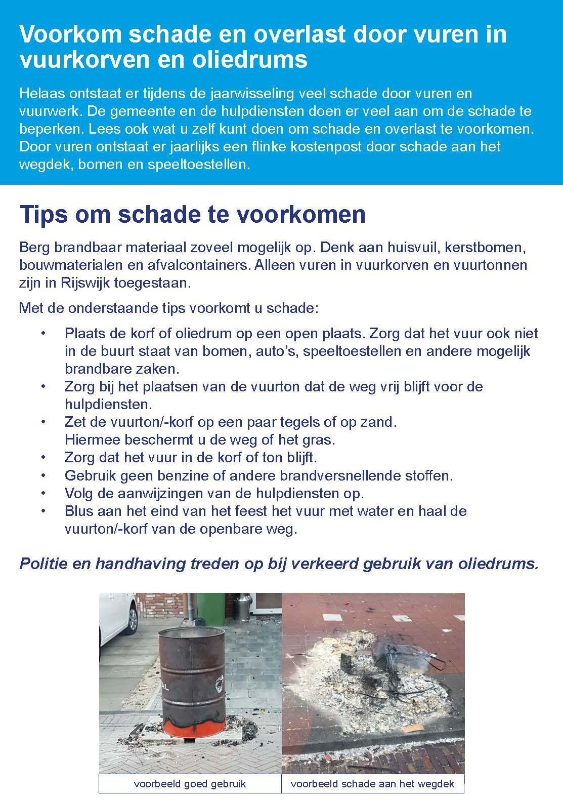 Burgemeester Michel Bezuijen is blij met het aangescherpte toezicht: “afgelopen jaarwisseling is veel schade ontstaan aan het wegdek door het verkeerd gebruik van oliedrums. Met name het herstellen van asfaltbestrating kost veel gemeenschapsgeld. Voorkom schade aan het wegdek door voorzorgsmaatregelen te treffen.”
