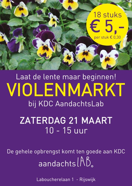 Op 21 maart organiseert het KDC Aandachtslab een violenmarkt aan de Labouchèrelaan 1 in Rijswijk. De volledige opbrengst komt ten goede aan KDC AandachtsLab, een kleinschalig en bijzonder kinderdagcentrum voor Ernstig Meervoudig Beperkte kinderen.