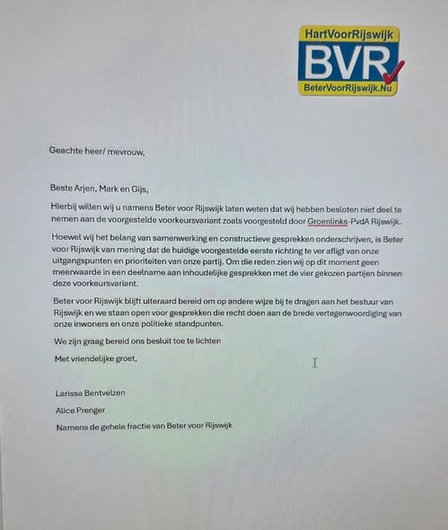 De lokale partij Beter voor Rijswijk neemt niet deel aan de voorgestelde voorkeursvariant voor samenwerking zoals die door GroenLinks en PvdA Rijswijk is gepresenteerd. Dat blijkt uit een brief die de partij heeft gestuurd aan betrokken gesprekspartners binnen de Rijswijkse politiek.