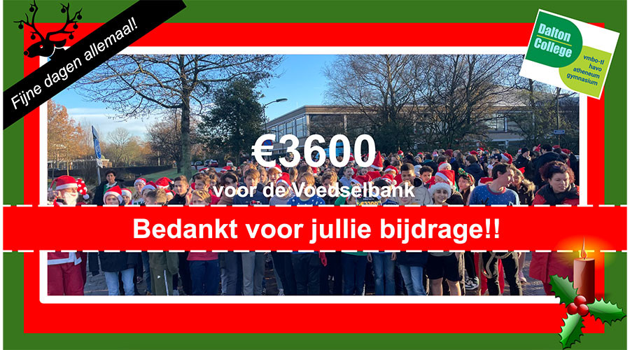 Dit schooljaar is er gekozen voor een SantaRun in de vorm van een sponsorloop. "Bijna 1000 leerlingen en collega’s hebben in hun mooiste kerstoutfit een ronde gerend waarbij een bedrag van maar liefst 3.600 euro is opgehaald", aldus de schoolleiding. "Na afloop was er voor alle deelnemers een lekkere oliebol en een warme chocolademelk. Het Dalton gaat er vanuit dat de voedselbank met deze ondersteuning weer veel gezinnen in financieel zwaar weer een fijne kerst kan bezorgen".