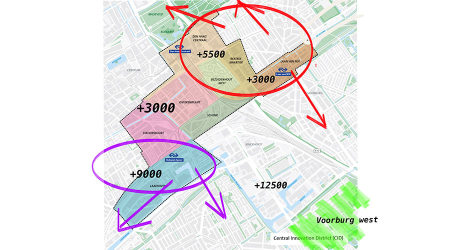 woningen is de ambitie ook om alle benodigde ondersteunende economische en maatschappelijke functies en minimaal 25.000 arbeidsplaatsen te huisvesten. Echter, veel van de ontwikkelingen in het CID-gebied, zoals rondom station Laan van NOI, hebben met name invloed op Voorburg-Noord, en in mindere mate op Voorburg-West. Daarnaast kunnen de ontwikkelingen in Laakkwartier en Stationsbuurt zorgen voor verkeersdruk van en naar de stad, waar Rijswijk mogelijk mee te maken krijgt".