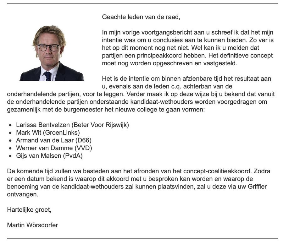 Woudstra bracht de volgende mededeling van formateur Martin Worsdorfer naar buiten.