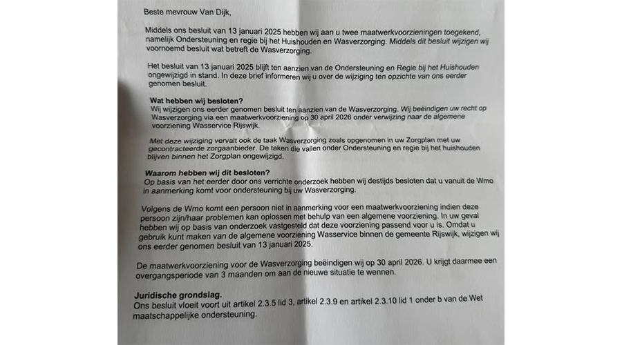 Zonder dat er ook maar één keer iemand langskomt om haar situatie te beoordelen, wordt doodleuk besloten dat extra hulp “niet nodig” is. En alsof dat nog niet erg genoeg is, wordt nu ook haar waszorg geschrapt. In plaats daarvan mag ze haar kleding meegeven aan een externe service, tegen betaling, met de hoop dat alles weer heel en compleet terugkomt.
