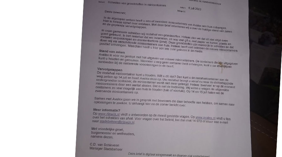 Weterings: "Het College op 5-7-2023 ondergrondse PMD-containers laat verwijderen (Karmozijnstraat) tegen alle afspraken in. Het College een brief heeft gestuurd naar een aantal inwoners die wordt ervaren als onduidelijk. Ook heeft niet iedereen die de afgelopen periode Kliko's / afvalbakken heeft ontvangen een brief gehad. Dat even terzijde. In de brief praat men over een restafval container (zie bijlage) die kan worden opgehaald. Nergens staat er duidelijk dat men ook de roze en blauwe 240 liter Kliko's/ afvalbakken komt ophalen".