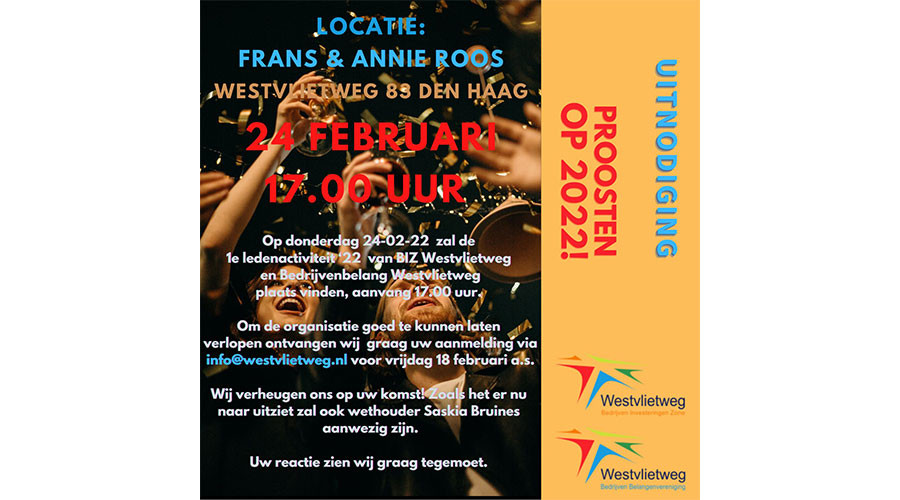 Op donderdag 24 februari 2022 wordt de eerste ledenactiviteit 2022 van BIZ Westvlietweg en Bedrijvenbelang Westvlietweg gehouden. Aanmeldingen ontvangt de organisatie voor vrijdag 18 februari a.s. via [email protected]