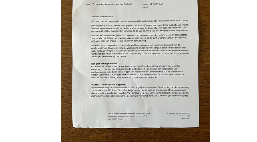 "Sta ik eerst om 14:30 in een dikke file voor de doseersluis op de Van der Kooijweg om vervolgens thuis te komen en deze brief aan te treffen".