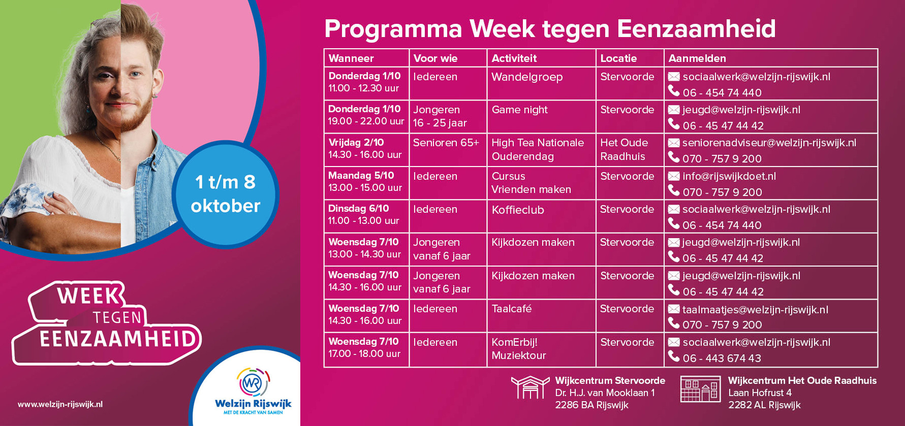 In het teken van de Week tegen Eenzaamheid organiseert Welzijn Rijswijk van 1 tm 8 oktober verschillende activiteiten om extra aandacht te vragen voor het thema eenzaamheid.